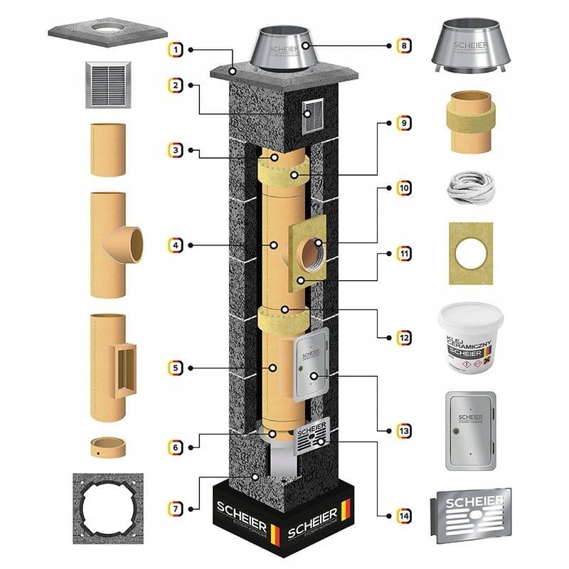 Komin SCHEIER STANDARD K 14m – Kompletny system kominowy, ceramiczny, nieizolowany w obudowie z pustaków keramzytowo-betonowych, jednociągowy bez kanałów wentylacyjnych.