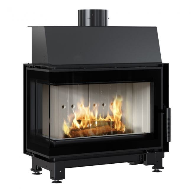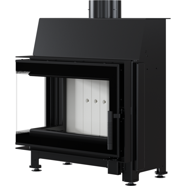 Narożny wkład kominkowy o drzwiach typu BS (szyby łączone). Dzięki takiemu rozwiązaniu możesz podziwiać ogień z dwóch stron w dwóch pomieszczeniach jednocześnie. Idealne rozwiązanie do łączonych pomieszczeń.