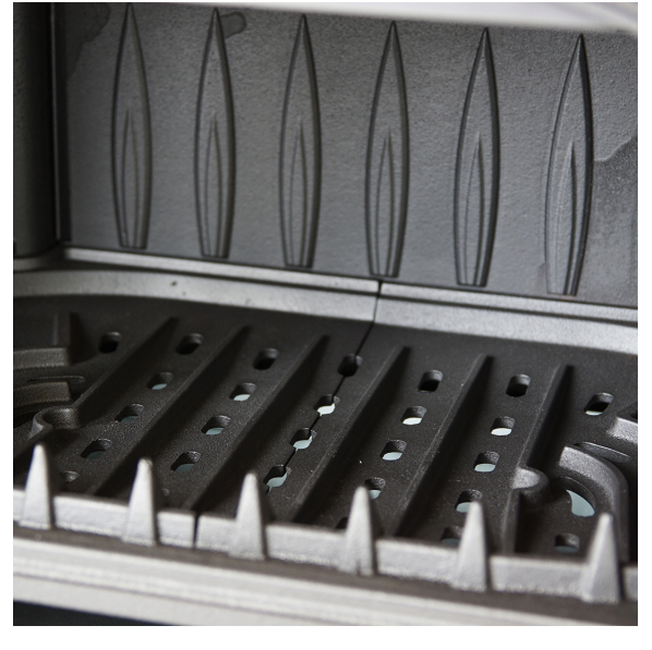 Szuflada/pojemnik na popiół, w których gromadzą się pozostałości po spalonym drewnie oraz ruchomy ruszt, ułatwiający usunięcie popiołu.